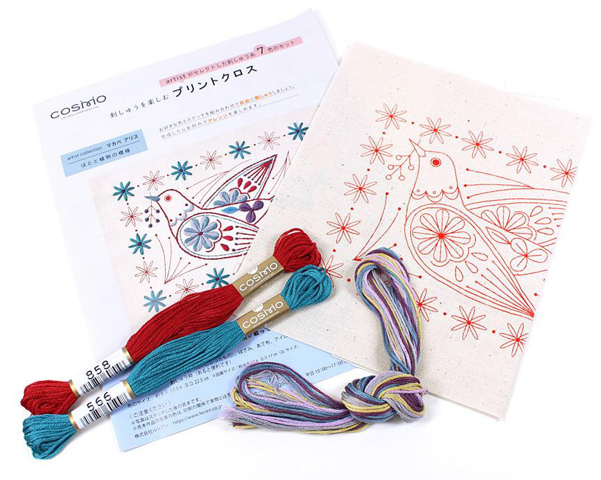 キットには、刺繍糸・布(図案プリント済み)・作り方説明書 が含まれます。